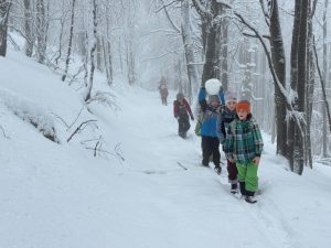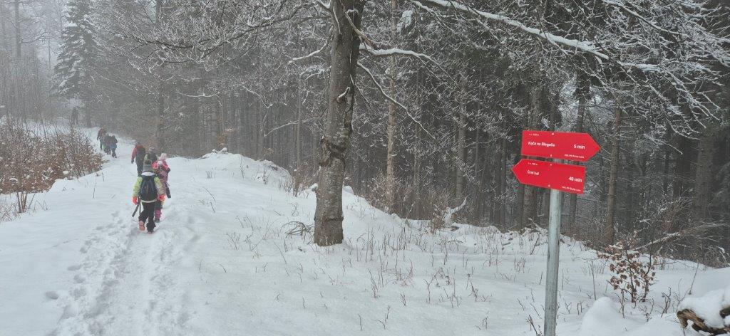 V koči so nas lepo sprejeli, kjer smo našli svoj kotiček, se ogreli in se okrepčali z malico iz nahrbtnika. Marsikdo si je privoščil tudi dobrote, ki jih je ponujalo ponudba v koči. Spočiti in siti smo se po poti čez Drugo ravan vrnili na Kal, kjer so jih že čakali starši.